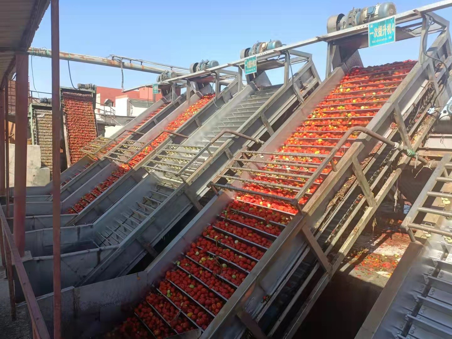 番茄加工厂中,提升机正在将番茄运送至生产线上